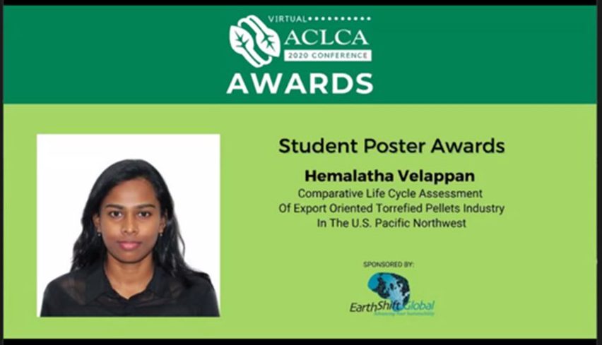 The presentation was Velappan’s first poster presentation at an international conference, and receiving the top award at such a high level is truly noteworthy. Her poster was about the Comparative Life Cycle Assessment of Export Oriented Torrefied Pellets Industry in the the U.S. Pacific Northwest.