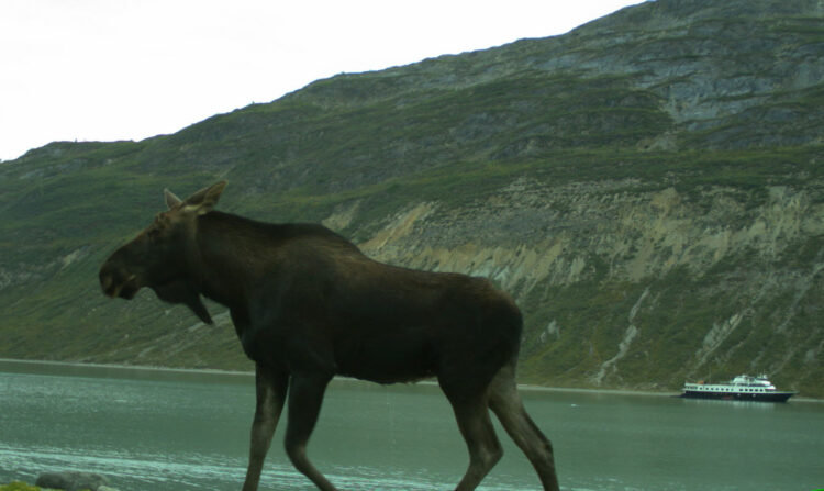 A moose walks by a wildlife camera, with a cruise ship in the background,