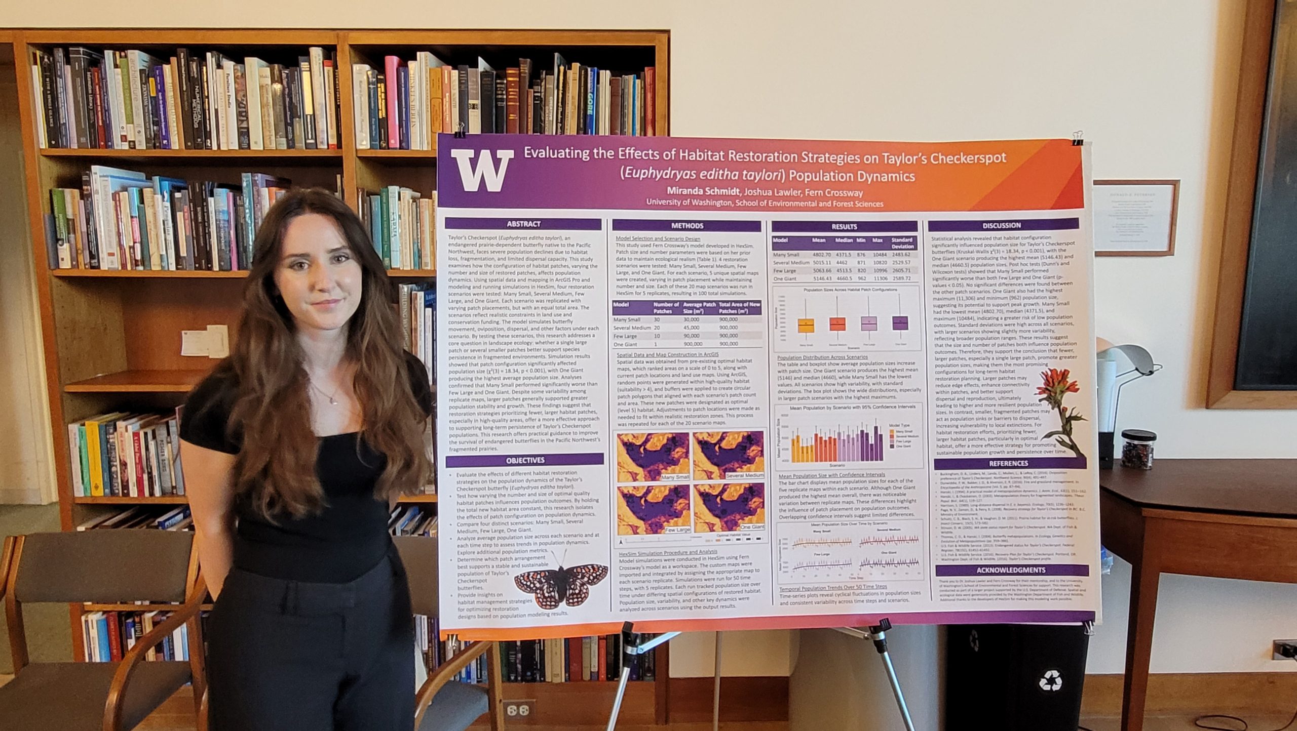Taylor’s Checkerspot, an endangered butterfly native to the Pacific Northwest, is threatened by habitat loss and fragmentation. This project uses GIS mapping and simulation modeling to test different habitat restoration strategies, exploring the effects of patch size and quantity. By modeling a set of representative restoration approaches, we aim to identify the best strategies to promote long-term survival. The results will guide practical conservation efforts to restore prairie ecosystems and support endangered species recovery.